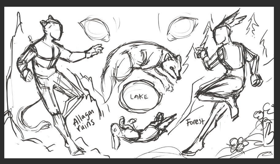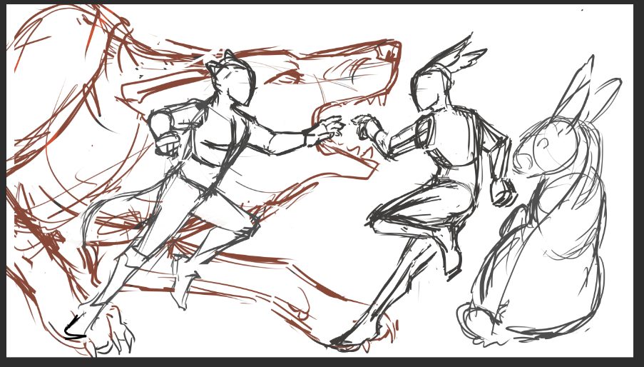 After reading the story, I sketched out a couple of options for the piece, the first being a busier composition that references the reoccurring theme of the red fox chasing the black hare across the lake. The second composition was simpler and had a more dramatic feel emphasizing the “chasing” theme in the story. I sent both to Ralma_Crissen for feedback and if they had a preference on which to move forward with