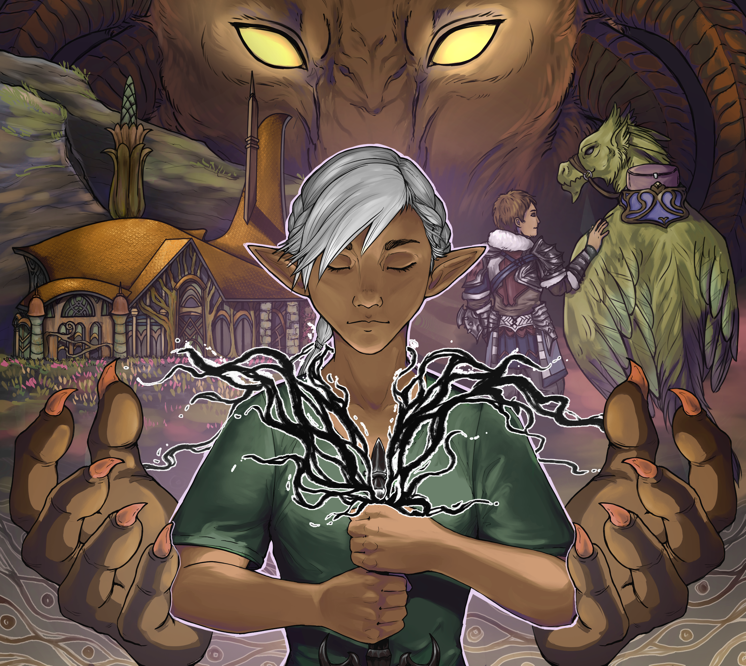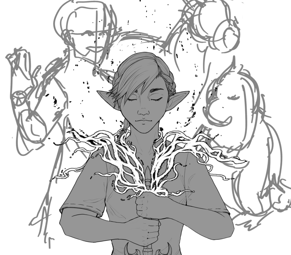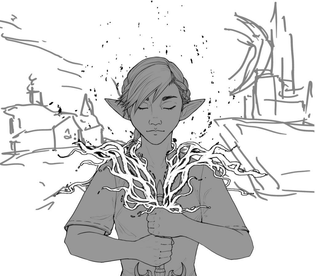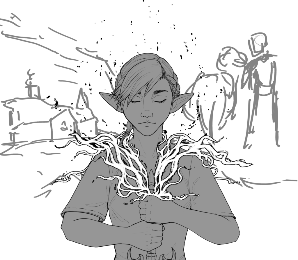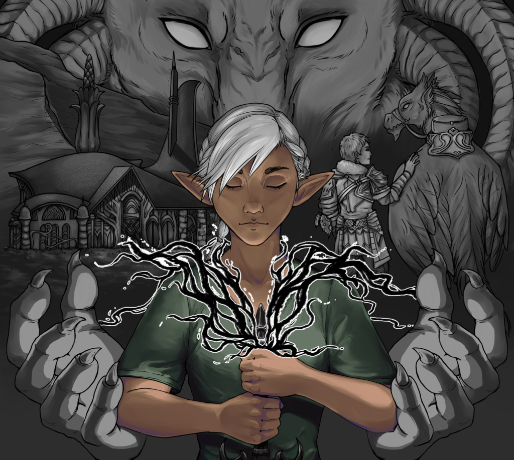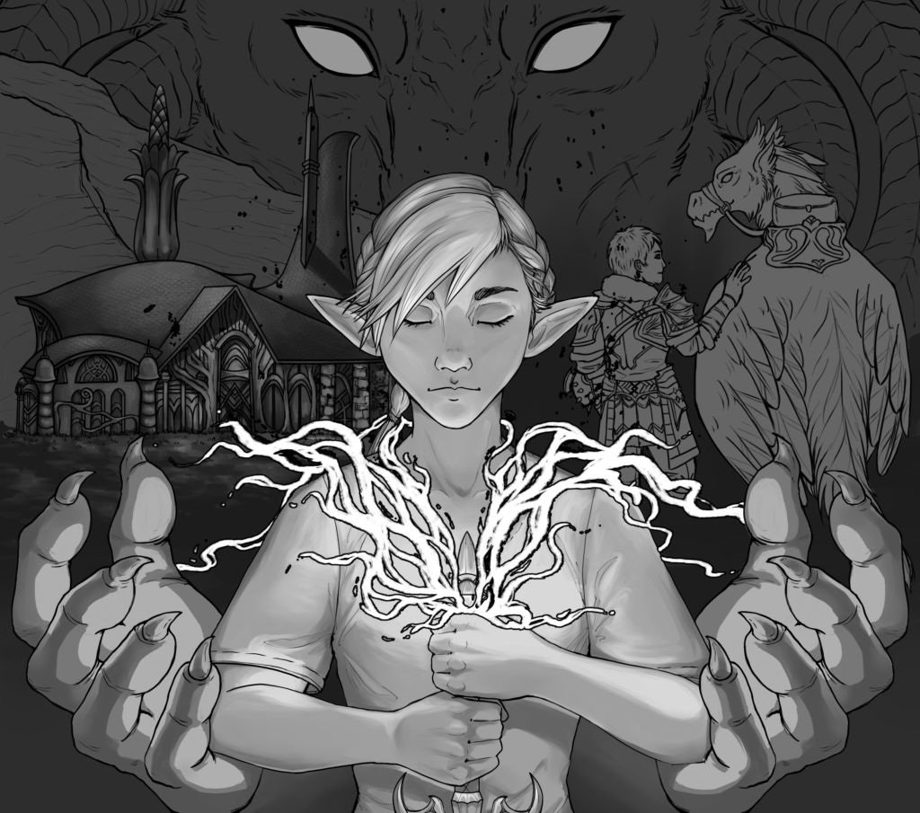 After reading the story, I knew I wanted to have Cylva, the protagonist, front and center and to have Pauldia’s monster form looming in the background. I had several options for the rest of the background that I sketched out and sent to KeeperofTennno to pick between.